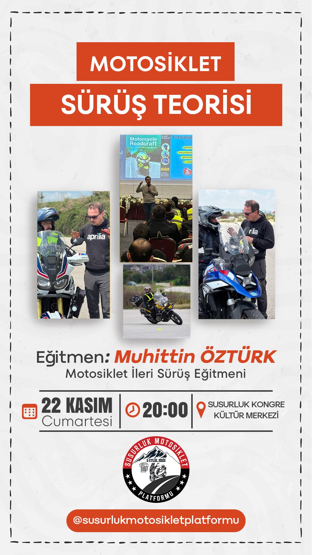 Susurluk Motosiklet Platformu’nun organizasyonuyla, ileri sürüş teknikleri eğitmeni Muhittin Öztürk’ün vereceği “Motosiklet Sürüş Teorisi” eğitimi, 22 Kasım 2025 Cumartesi günü Susurluk’ta yapılacak.