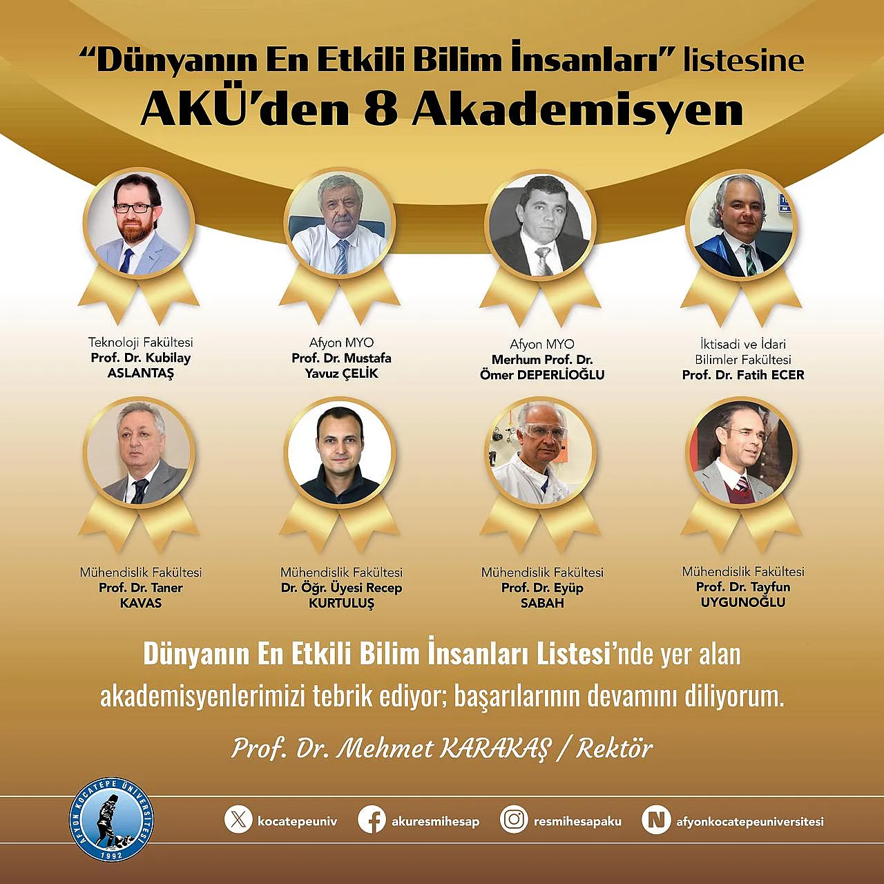 2025 Etki Sıralamasına Giren AKÜ’lü Akademisyenler: • Prof. Dr. Fatih Ecer • Prof. Dr. Tayfun Uygunoğlu • Merhum Prof. Dr. Ömer Deperlioğlu • Prof. Dr. Taner Kavas • Prof. Dr. Kubilay Aslantaş • Dr. Öğr. Üyesi Recep Kurtuluş • Prof. Dr. Mustafa Yavuz Çelik